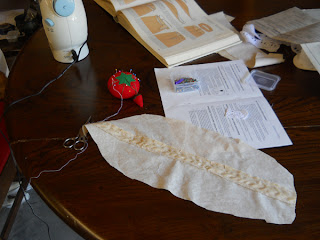 I started making a detachable feather trim for the cuffs, white fluffy feathers sewed to a white ribbon (chicken feathers; I bought a bunch of them and it looks like I've been on a plucking spree--my house is adrift in bits of fluff). But the trim looks superfluous with the crochet trim I've already got in place, and if I fold the trim up to pin the feather trim in place, they're not nearly as cute. So I'll use the feathers for something else.